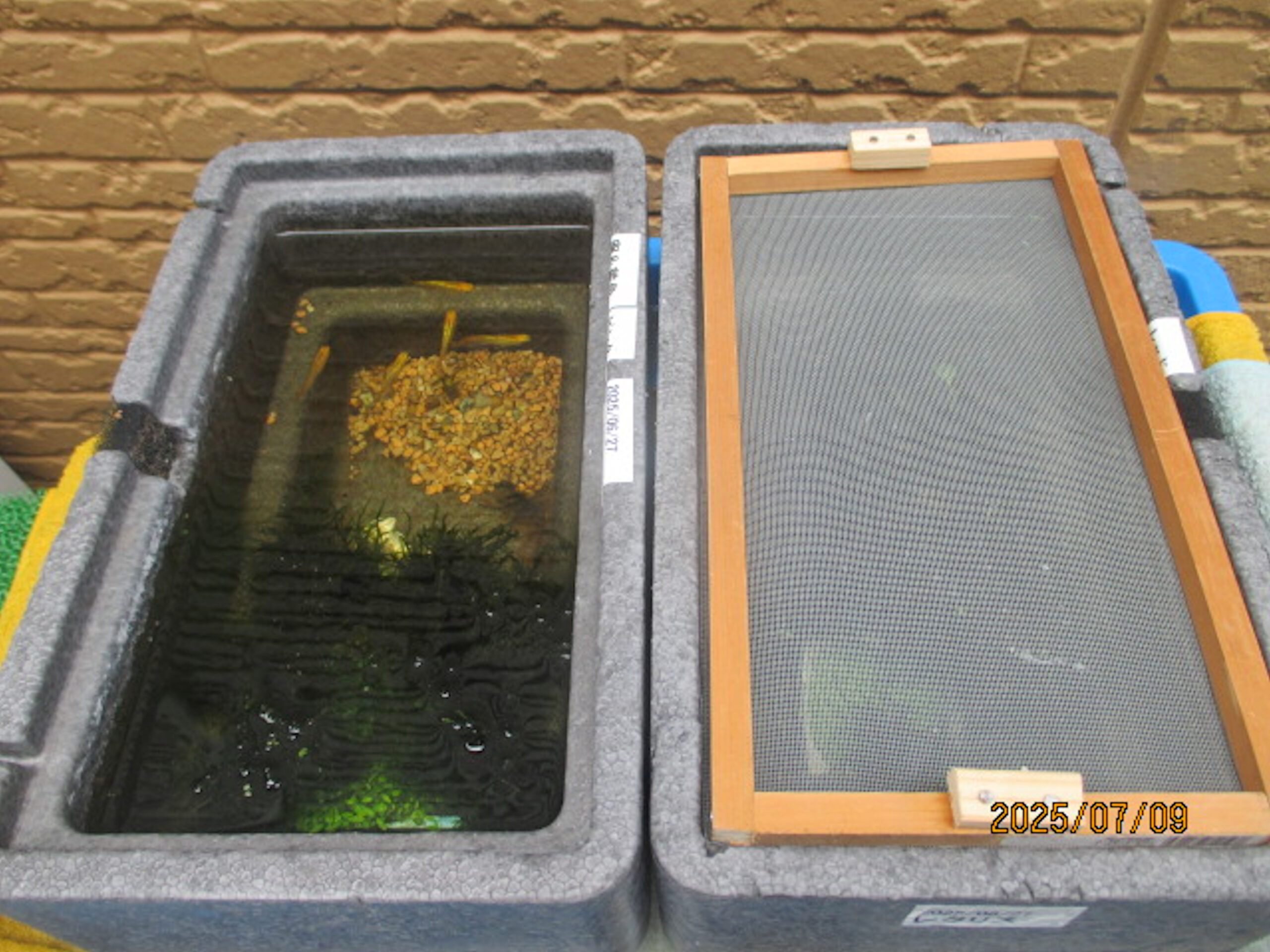 網戸の無い親メダカ(レクリス)水槽と網戸付きの孵化水槽。↓