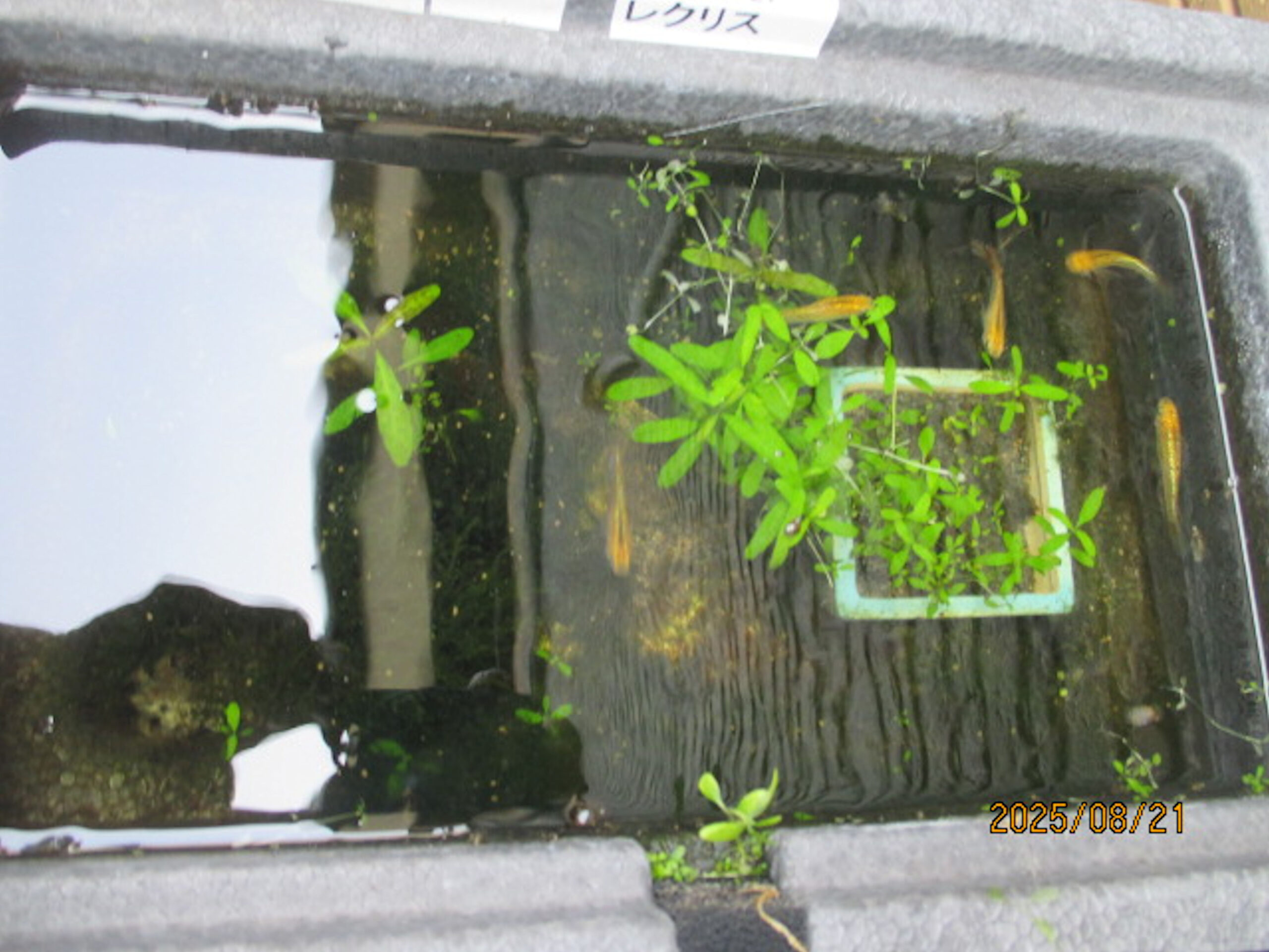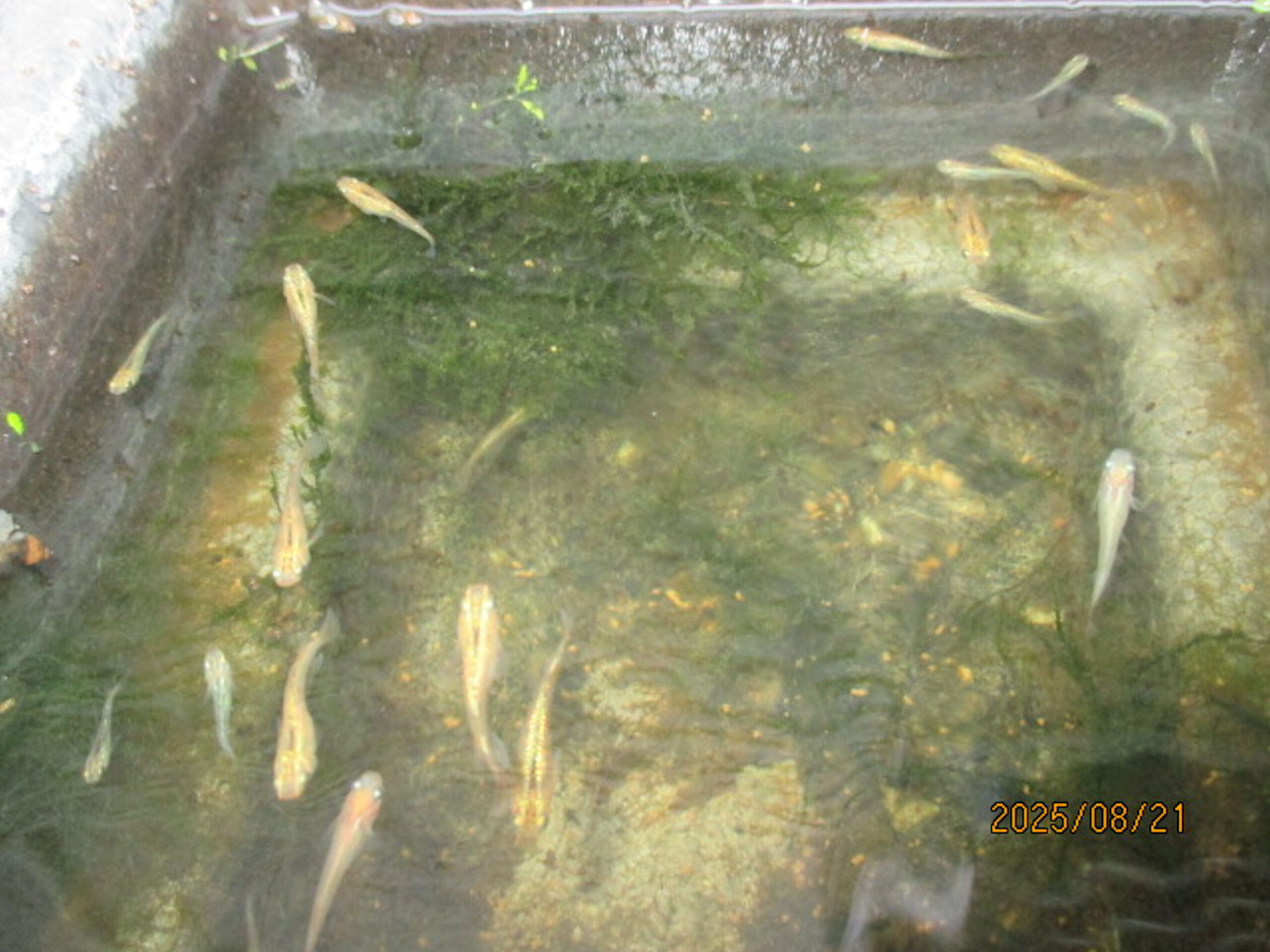 猛暑で孵化しても育たない稚魚が多い中、水草とすだれで調整して水温を25度に維持できたことが良かった。