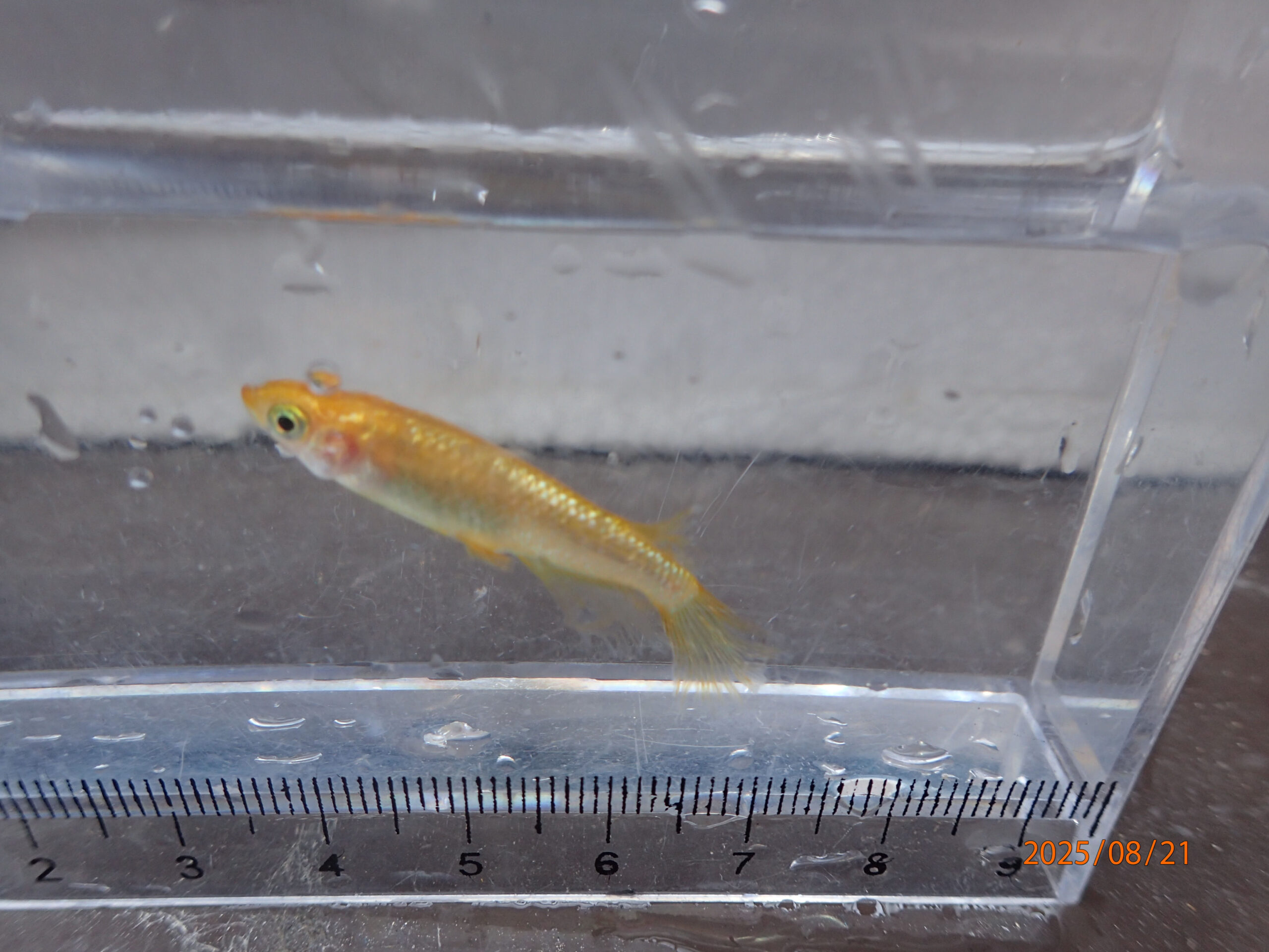 特徴は黄金色でラメが入って尾ビレが長い。全長4cmほど。
