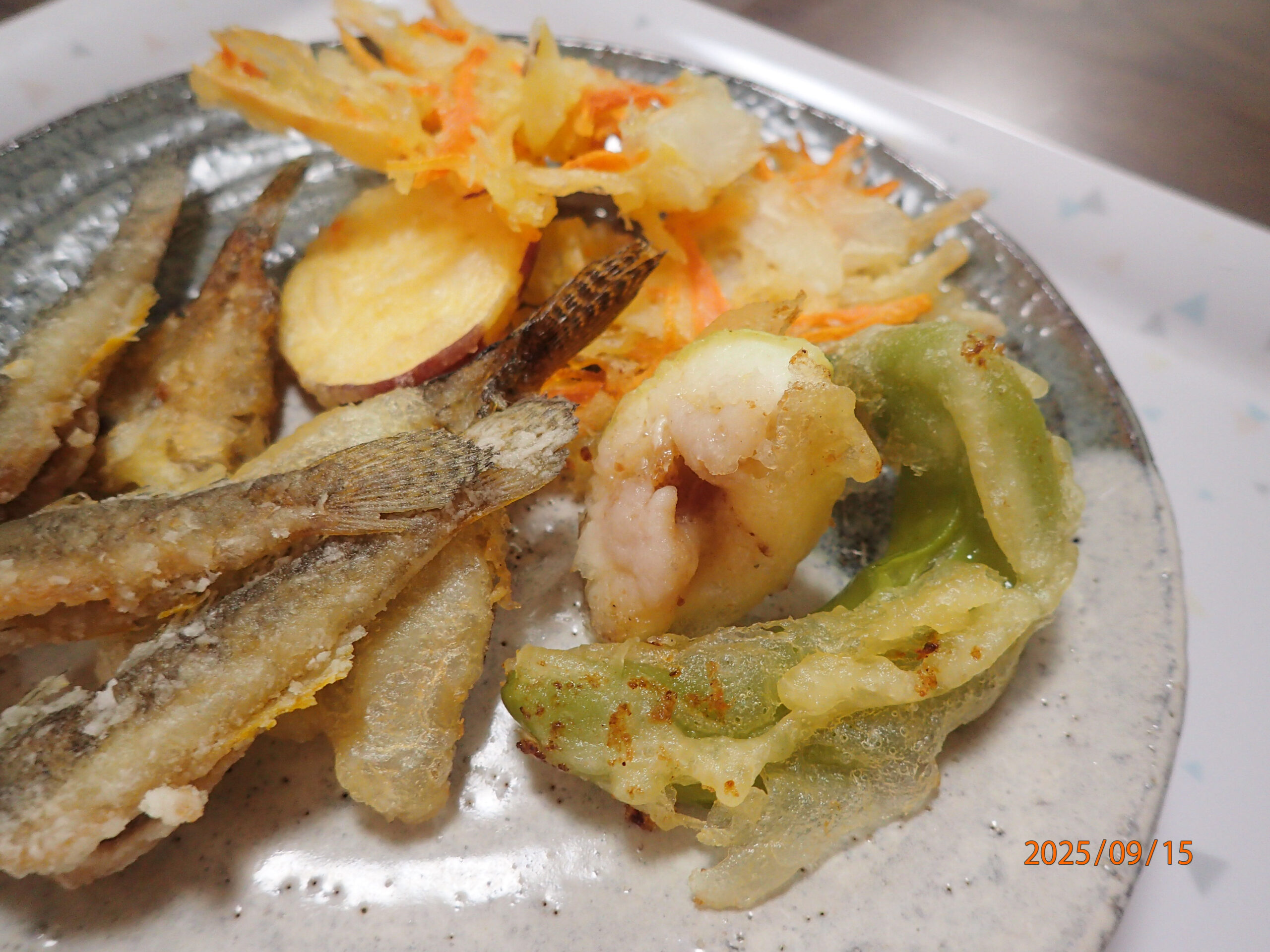 僕がろばたで焼いている間に妻がハゼ天を揚げた。↓