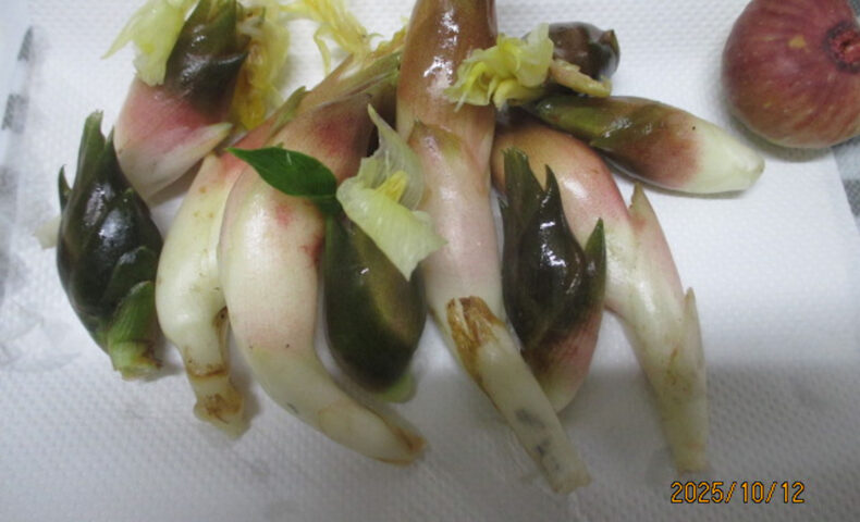 さて、雨上がりの今朝ミョウガを見つけた。↓