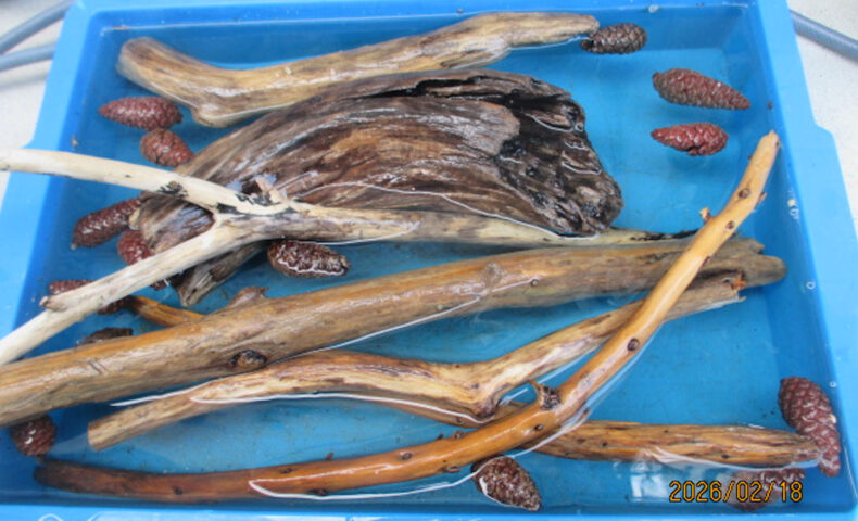 帰って来て前日拾ってきた流木と松ぼっくりの処理。↓